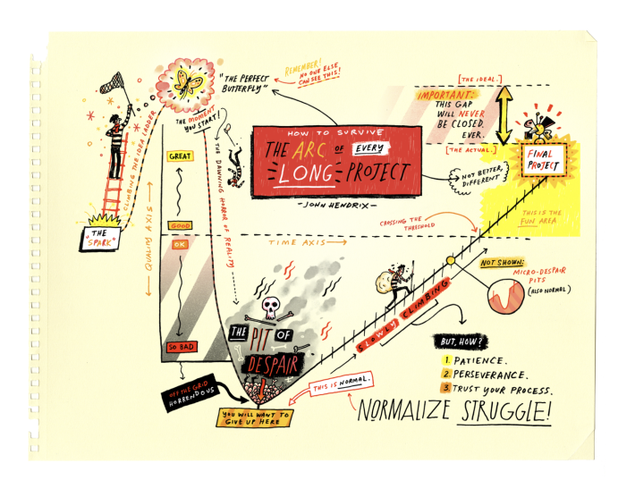 I’m certain the answer is yes. As a professor at Washington University in St. Louis, I often get annoyed at the artificial divide that people make between the humanities and STEM—it seems like a strange distinction to make in a world of infinite learning. I made a chart for the artists and illustrators in my graduate program (MFA Illustration and Visual Culture) about the psychological contours of every long project; I lovingly call it the pit of despair. I made this for artists, and yet the people who respond to it the most are in fact, scientists! Even people working on their Ph.D. and business professionals have seen the same pattern in their own work. So it’s a universal human phenomenon—we just can't realize our ideas like we first imagined them!