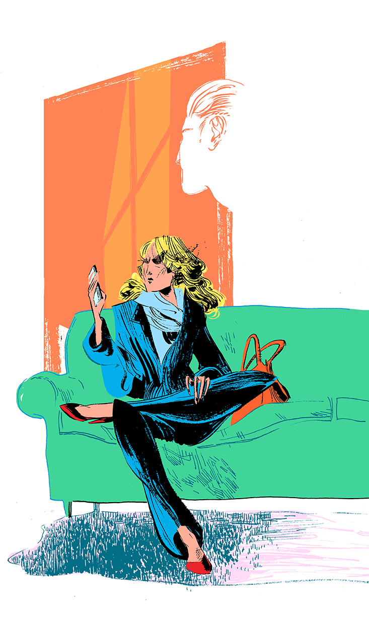 A woman sat on his couch. Anglo, mid-forties, she was dressed in a smart black suit and typing on her phone. A nice orange purse sat at her side. Ms. Eglantine Zaffi.