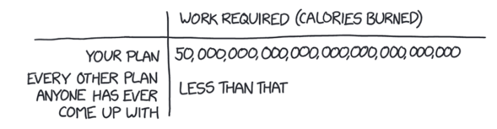 Did you at least avoid exercise? Well, sort of. Your project ended up requiring you do an awful lot of work. Removing the Earth’s surface required 5 x 1028 calories of energy, which is more calories than would be burned if the entire human population started doing intense workouts 24 hours a day from now until when the sun burned out and its remnant cooled to room temperature.