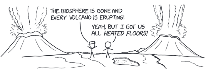 You use your Dyson sphere to remove more rock. You’ve now stripped away a 5-kilometer layer, which takes about 20 minutes. (For good measure, you spend another few minutes removing the oceans.) The Earth is no longer remotely habitable. Thanks to the exposed magma under the Yellowstone super volcano, northwestern Wyoming is a lake of lava. The ground in most places is hot enough to boil water and start fires.