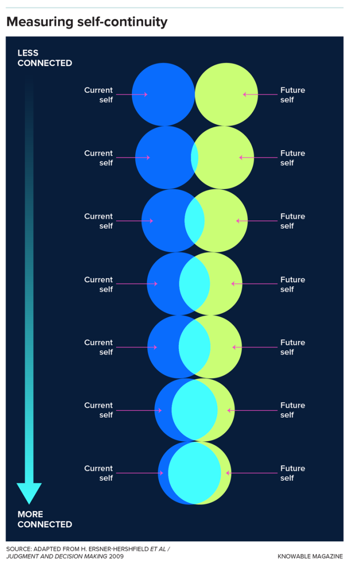 “Some people feel a great degree of overlap and continuity with their future selves, and some people don’t even think about that self, and it feels almost like a stranger,” says psychologist Hal Hershfield of the University of California, Los Angeles.