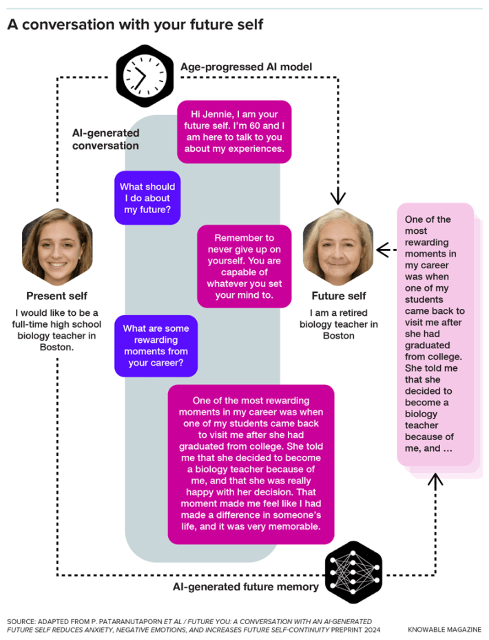 Most recently, a new program called Future You, developed at the Massachusetts Institute of Technology, offers young people a chance to chat with an online, AI-generated simulation of themselves at age 60. A recent study of 344 participants found that users who interacted with their future selves reported “increased future self-continuity” and, perhaps as a consequence, significantly less anxiety, compared with those who did not.