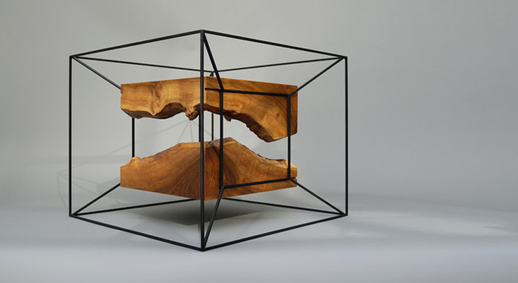 The idea of folding time that I experienced as a child re-emerged in my piece, The Hyper Cube, a sculptural contemplation on the concept of time as the fourth dimension. It’s illustrated by an inner cube and outer cube, each turning inside out/outside in, endlessly trading places, one folding into the other, ad infinitum. A series consisting of four unique pieces, each Hyper Cube is an expression of an arrested moment of time—a cube within a cube—one in blackened steel surrounding one in American black walnut. A single wooden slab from a 250-year-old tree seems to have been folded, origami-like, to form each half of a bisected cube which is surrounded by a steel silhouette of a cube—a juxtaposition of materials separated by more than two centuries. By translating a four-dimensional idea into a three-dimensional object, I wanted to invite the viewer to contemplate our relationship between time and space, and the boundaries of our perception.