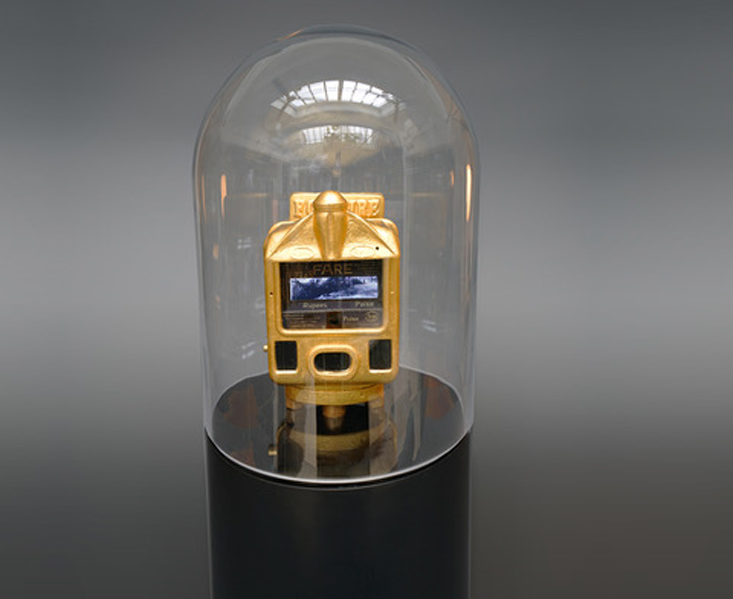 When All Roads Are One, a vintage taxi meter from India—gilded in 23-karat gold to evoke a reliquary—merges the films of the four individual pilgrimage rides into one progressive, yet parallel journey. The films, converted from color to black and white, blur the traditional signals that signify oppositions. Boundaries between day and night, urban and rural, past and present all converge in an allegorical excursion that represents our collective connection to a metaphysical existence—as well as to one another—as an infinite ongoing journey outside of time.