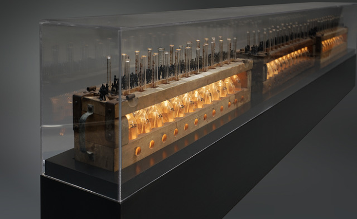 The Genesis Series, a set of seven assemblage sculptures completed over the past eight years, brings Hebrew biblical text and symbols of the creation narrative into a visual dialogue with vintage scientific apparatus. Each sculpture’s composition is formed by recontexualizing objects, pulled from the spectrum of time and inscribed with their prior existence. Laboratory beakers and tubes dating from as early as the 1940s and 19th-century glass domes—symbols of the empirical world—are engraved with Hebrew text and juxtaposed with Torah finials and crowns from the 18th and 19th centuries. These self-contained universes become unbound from the time-based identity of their disparate elements—formerly points on a linear continuum stretching into the past—as they converge and transform into a metaphorical discourse on the intersection of science and religion, and creation as an ongoing dynamic.