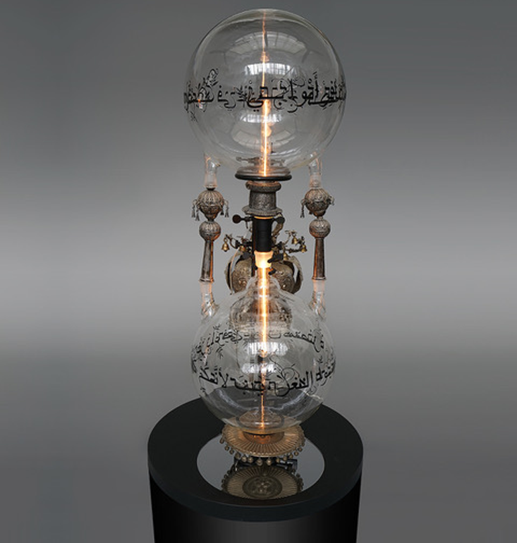 Sacred text engraved on the sculpture’s glass beakers in Hebrabic/Arabrew—a melding of Hebrew and Arabic phrases that I created in 2010—form a metaphorical parallel to Maimonides: a contemporary exploration of traversing the cultural chasm of otherness. The intertwining languages also invite a point of contemplation. Though these two cultures have become disparate in our contemporary existence, with compassion, there is a parallel narrative where contrasting ideologies have the potential to co-exist. In the impending global shift toward exclusion and segregation, the axis of light traversing the glass spheres evokes humanity’s connectivity.