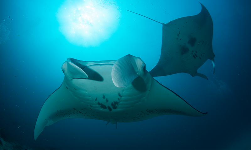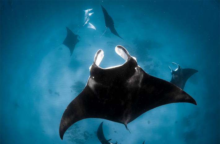 Her pulse rose: A handful of reef manta rays—Mobula alfredi—hovered above a coral outcrop, faced into the current, waiting to be cleaned. A few more traced graceful circles farther back in line. Evie made out many old friends. Kaute, Sandy, Tomo: every manta had a unique pattern of spots on their white underbellies, ventral patterns as distinctive as fingerprints. A serpentine mark just above the right pelvic girdle confirmed Mona, one of her favorites, who turned and floated up to say hello.