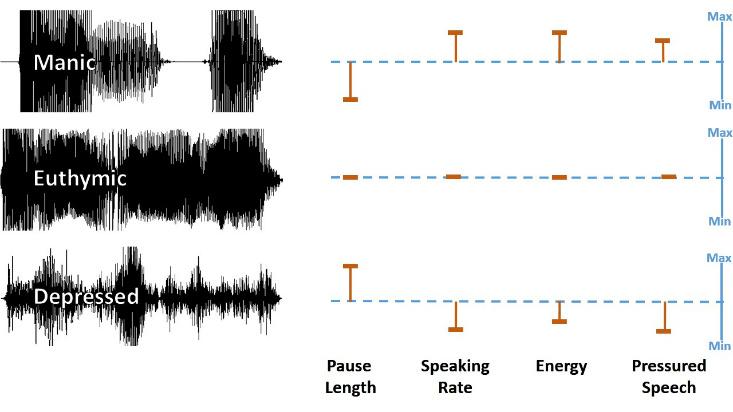But McInnis is interested in the transition period preceding states of mania and depression. With computer scientists Emily Mower Provost and Zahi Karam, also at the University of Michigan, he has started the PRIORI project to analyze speech waveforms for features like pitch, loudness, and tempo that may predict a mood swing in the near future, before any recognizable change in mood emerges. For example, a single feature, like loudness, may flag a person on the path to mania or depression once it crosses some threshold. Or telltale signs could come from a combination of these features, or the way they change over a few days. The project was funded in 2013 by the National Institute of Mental Health, so it’s still in its early days. Though they don’t yet know what will make the best predictors, the researchers have come up with an algorithm that estimates the probability that a snippet of speech came from a depressed or manic state.