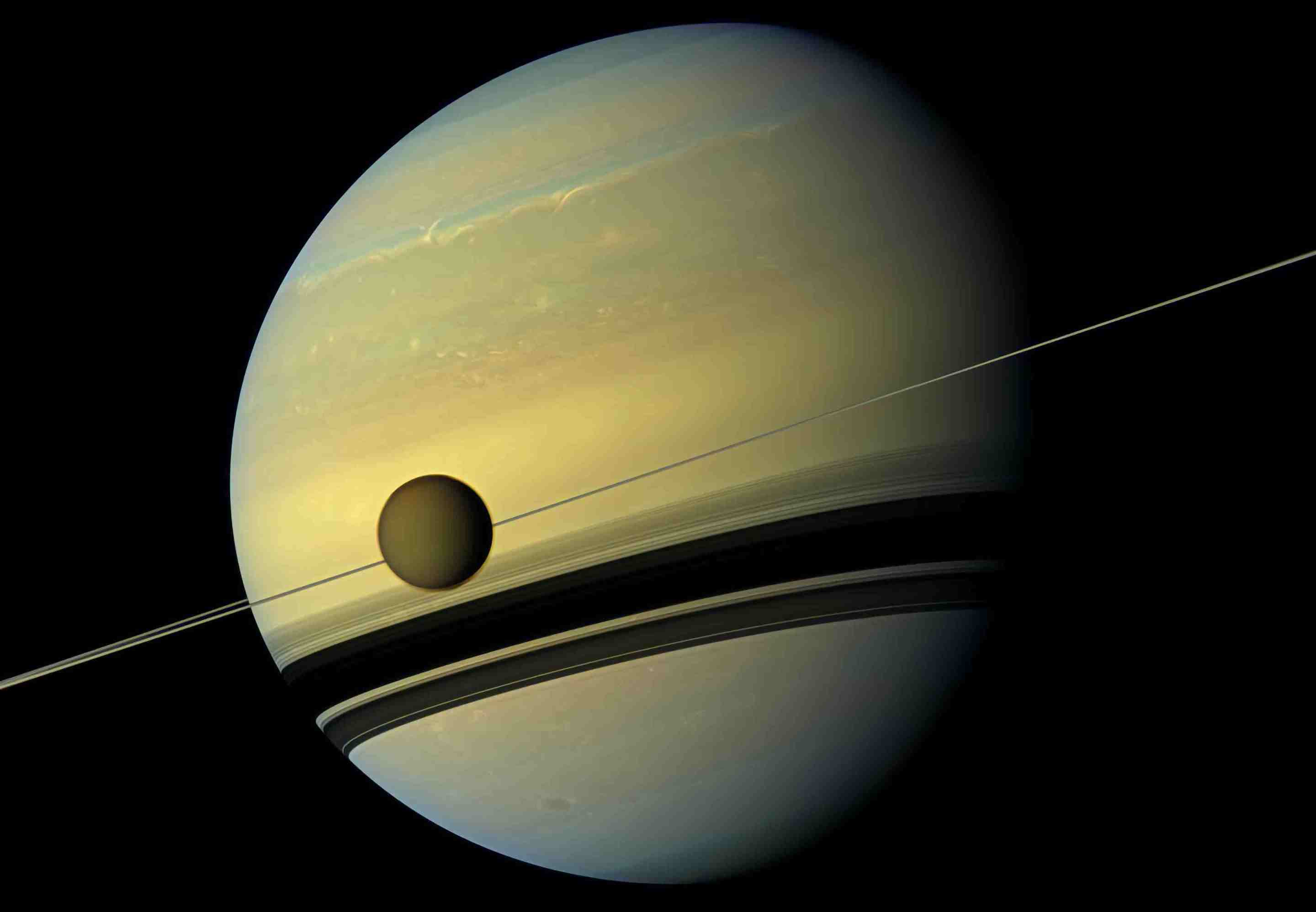 Lead image: A real-color image of Titan in orbit around Saturn. The dark black bands are shadows cast by Saturn’s rings. CREDIT: NASA/JPL-Caltech/Space Science Institute