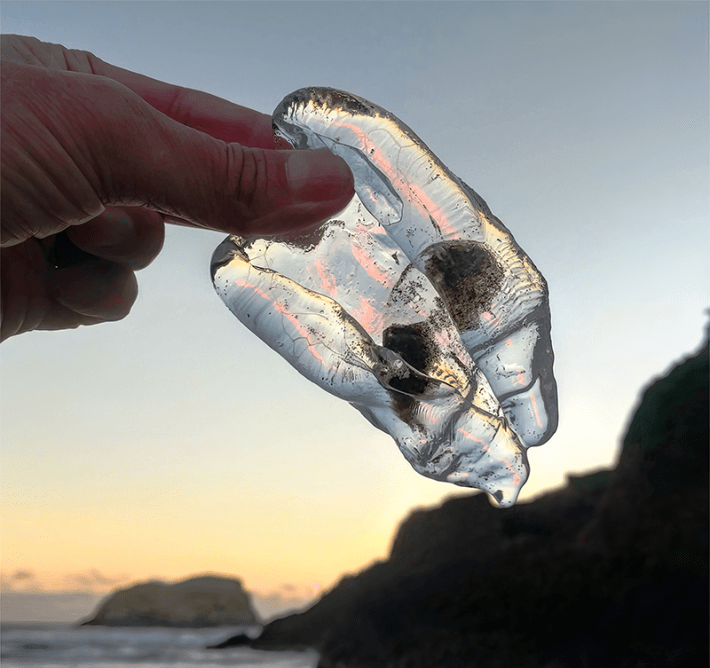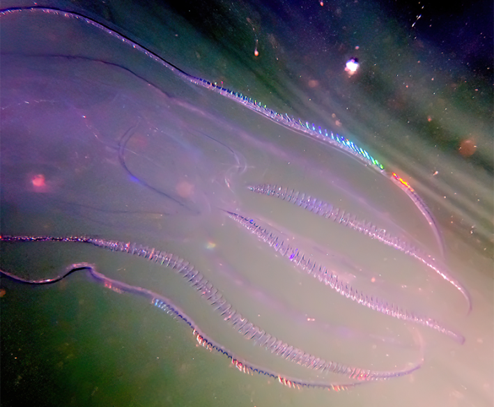 Just as differences in the refractive indexes—the degree to which light bends when entering or exiting a medium—of structures within an animal are important, so is the difference between an animal and its surroundings. Put the salp back in the ocean, its natural environment, and it disappears. Salps, comb jellies, and jellyfish are all aquatic animals who mainly consist of water—and when placed in water, the salp’s outline effectively disappears. Its refractive index is nearly the same as its environs. When held in comparatively low refractive index air, though, the salp is visible.