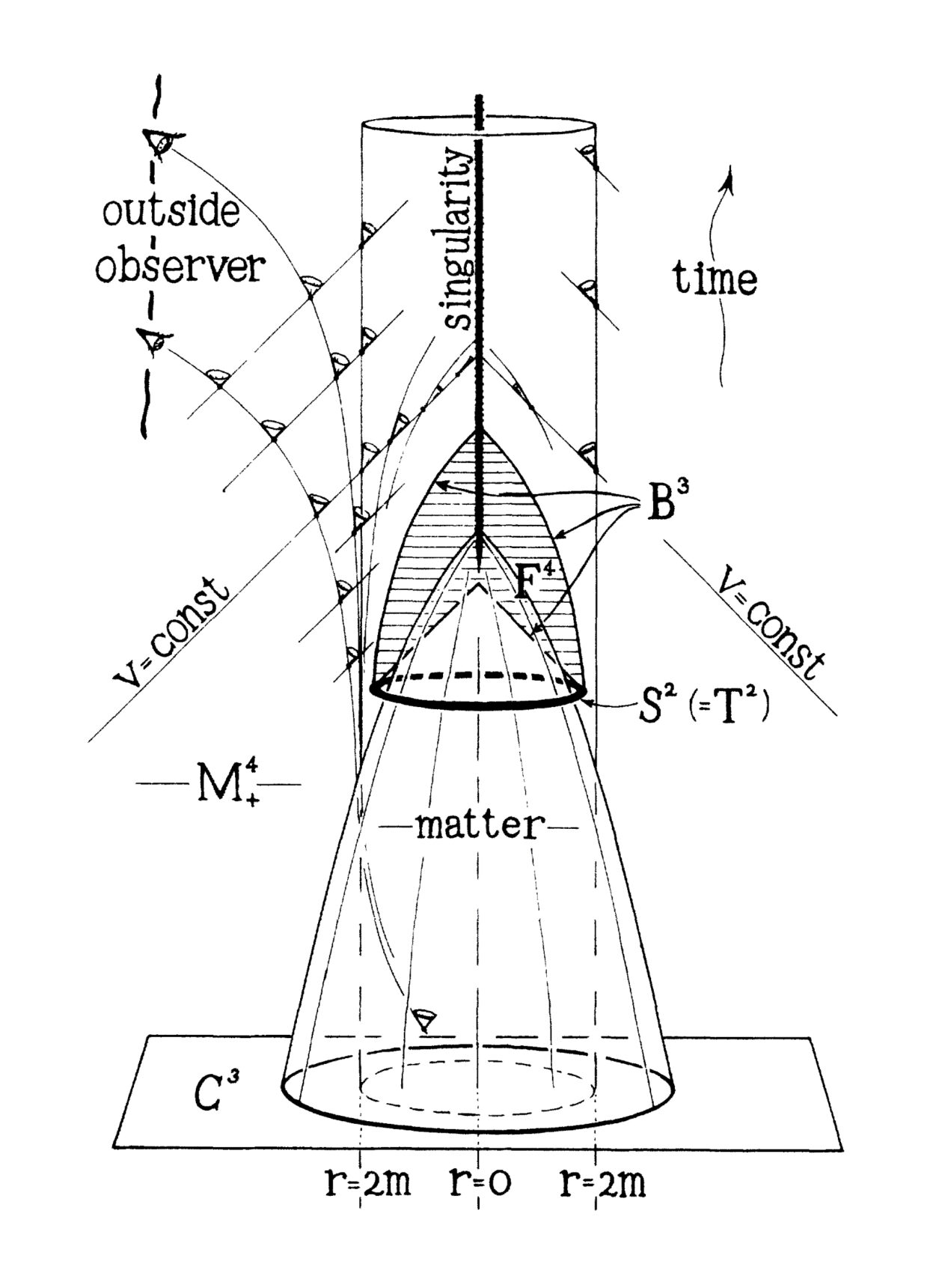 Penrose showed that, as he put it in his 1965 paper, “deviations from spherical symmetry cannot prevent space-time singularities from arising.” In other words, even when a star is distorted, it will still collapse down to a point. He showed this by introducing the notion of a “trapped surface,” as well as a now-famous diagrammatic scheme for analyzing how the surface sits inside space-time. Unlike a regular surface, which can have light rays shooting away from it in any direction, a trapped surface is a closed two-dimensional surface that—even when distorted so it’s no longer a sphere—only allows light rays to go one way: toward the center point.