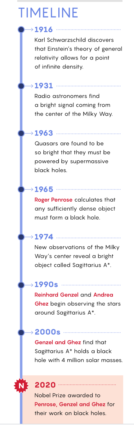 2020's Nobel Prize in Physics has been awarded for earlier work that indirectly established the existence of black holes. The English mathematical physicist Roger Penrose won half the prize for his 1965 paper showing that “black hole formation is a robust prediction of the general theory of relativity,” according to the Nobel committee. The other half was shared by rival astrophysicists Reinhard Genzel and Andrea Ghez, who made groundbreaking observations of stars orbiting the Milky Way’s center that suggested that a supermassive, invisible, compact object must reside there.