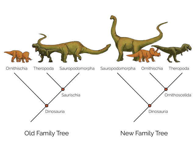 This split between bird-hipped and lizard-hipped dinosaurs has been entrenched among dinosaur researchers since Seeley’s days. But in a 2017 study in Nature, a team led by paleontologist Matthew Baron of the University of Cambridge in England proposed a radical reconfiguration of that arrangement. Baron and his team suggested that the ornithischian-saurischian classification should be set aside in favor of a revised tree in which the dichotomy in hip structure is not all-encompassing. This new classification combines theropods with ornithischians in a new group called Ornithoscelida, while the sauropods and herrerasaurids—an early group of carnivores that died out in the Triassic—remain as the saurischians (technically sauropodomorphs).