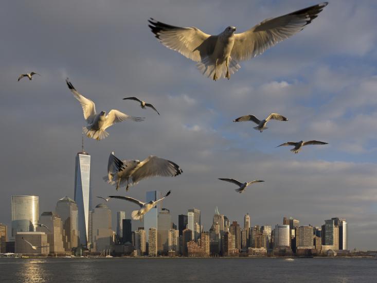 But what the birds don’t seem to learn is that major cities—during day or night—can be serious migratory hazards. On foggy nights, migrant birds confuse building lights with stars, drawn toward the inverted sky of the city, and during the migration season in New York, thousands of birds are swept into the spotlights of the Twin Towers memorial, aimlessly circling the bright shafts; if necessary, the lights are turned off for a few minutes, allowing the spell to break and the birds to move on. Many cities try to turn off the lights on major buildings during migration periods, but billions of birds still end up in scanty patches of habitat in suburbs and downtown areas.