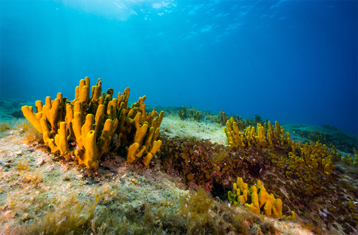 As ecosystem engineers, sponges are among the best in their field. After they die, the remains of sponges’ skeletal parts help stabilize the seafloor and act as a welcome mat for colonizing benthic organisms. For instance, after the massive Ordovician extinction, which wiped out much of life on Earth 445 million years ago, sponges laid a foundation that helped marine ecosystems recover by leaving a textured substrate on which corals and other benthic animals could take hold.5 This, in turn, helped support reefs, kelp beds, and other key building blocks for ocean food webs. And before they die, live sponge beds, or aggregations, as they are often called, also provide habitat for fishes and other marine life by creating physical structures in which these animals can forage and hide.