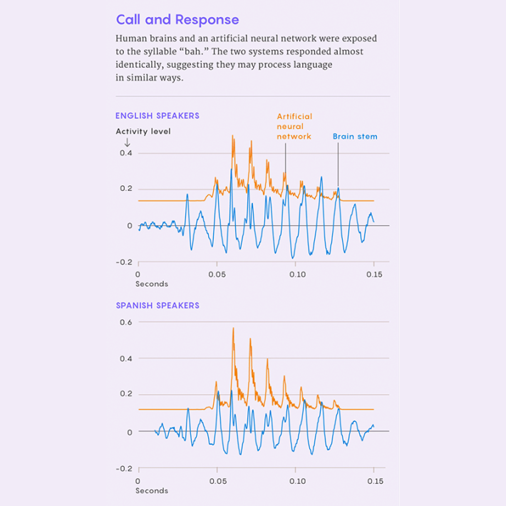 To establish a baseline for the human side of the comparison, the researchers played a single syllable—“bah”—repeatedly in two eight-minute blocks for 14 English speakers and 15 Spanish speakers. While it played, the researchers recorded fluctuations in the average electrical activity of neurons in each listener’s brainstem—the part of the brain where sounds are first processed.