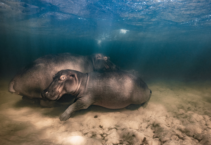 An image years in the making: Seemingly coy hippopotamuses (Hippopotamus amphibius) sit below the surface of the water, eyes fixed on the camera. After extensively researching this specific family, including taking underwater drone footage of their behavior, photographer Mike Korostelev eventually felt comfortable enough to jump in and take this image. Why all the preparation? These hefty creatures kill more people per year than sharks, making an underwater image of them as spectacular an endeavor as it is dangerous.