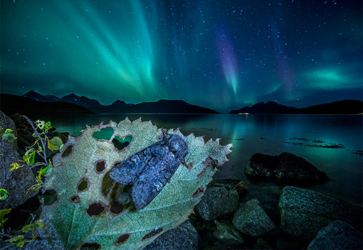 An Arctic moth perches on a leaf in the night, theoretically on the lookout for a mate. Thanks to the freezing temperatures, and flanked by the ethereal tendrils of the Northern Lights, it moved very slowly, allowing the photographer to capture it.