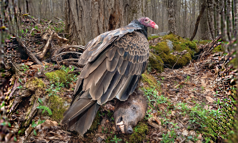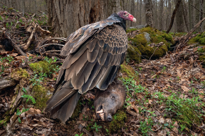 The defensive posture and uncanny eye contact of the turkey vulture pictured here makes it seem as though we’re interrupting an intimate moment, but photographer Nathaniel Peck wasn’t even present when this particular image was snapped. Peck’s photo was shot with a camera trap.