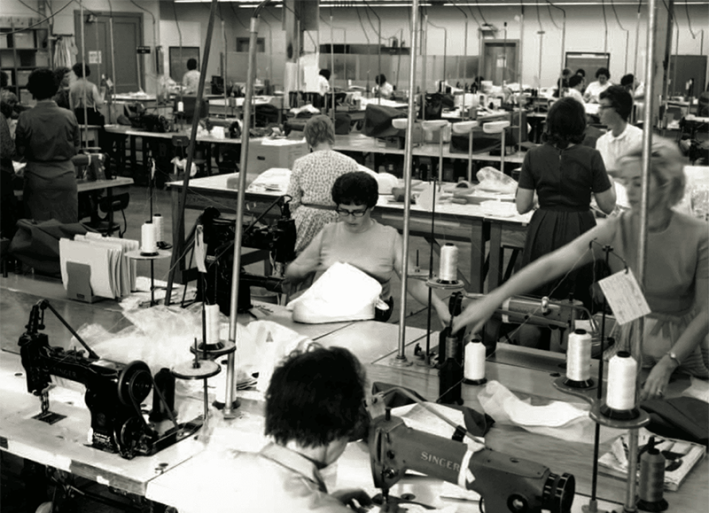 At the same time that ILC’s seamstresses were being asked to meet unprecedented precision standards, they were denied traditional tools, such as fastening pins used to maintain sewing accuracy. To a garment whose reliability depended on an impermeable rubber bladder, mechanical aids like pins were an inherently risky proposition. (The company learned that lesson in 1967, after a single pin was discovered between the layers of a suit prototype, leading to the installation of an X-ray machine on the shop floor that would regularly scan the suits for errant fasteners.)