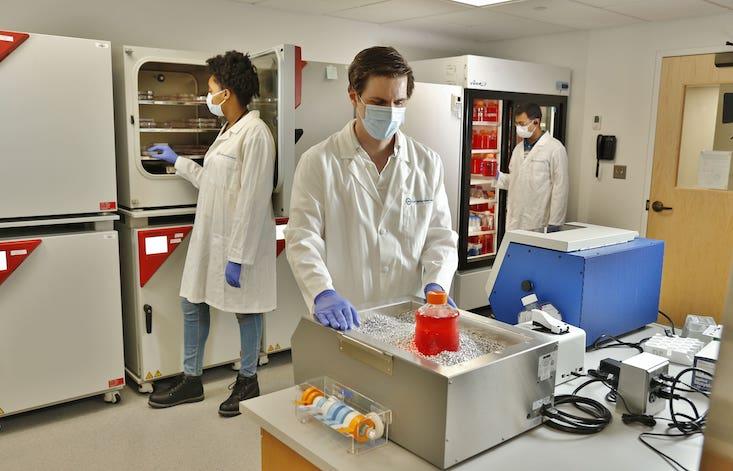 PATIENTS IN A DISH: Organoids are three-dimensional, live tissue models grown from patient tumors. They “are essentially patients in a dish,” says Dennis Plenker (center) of Cold Spring Harbor Laboratory. At the CSHL organoid facility, Plenker works with Luce St. Surin (left) and Hardik Patel (right). Bob Giglione / CSHL
