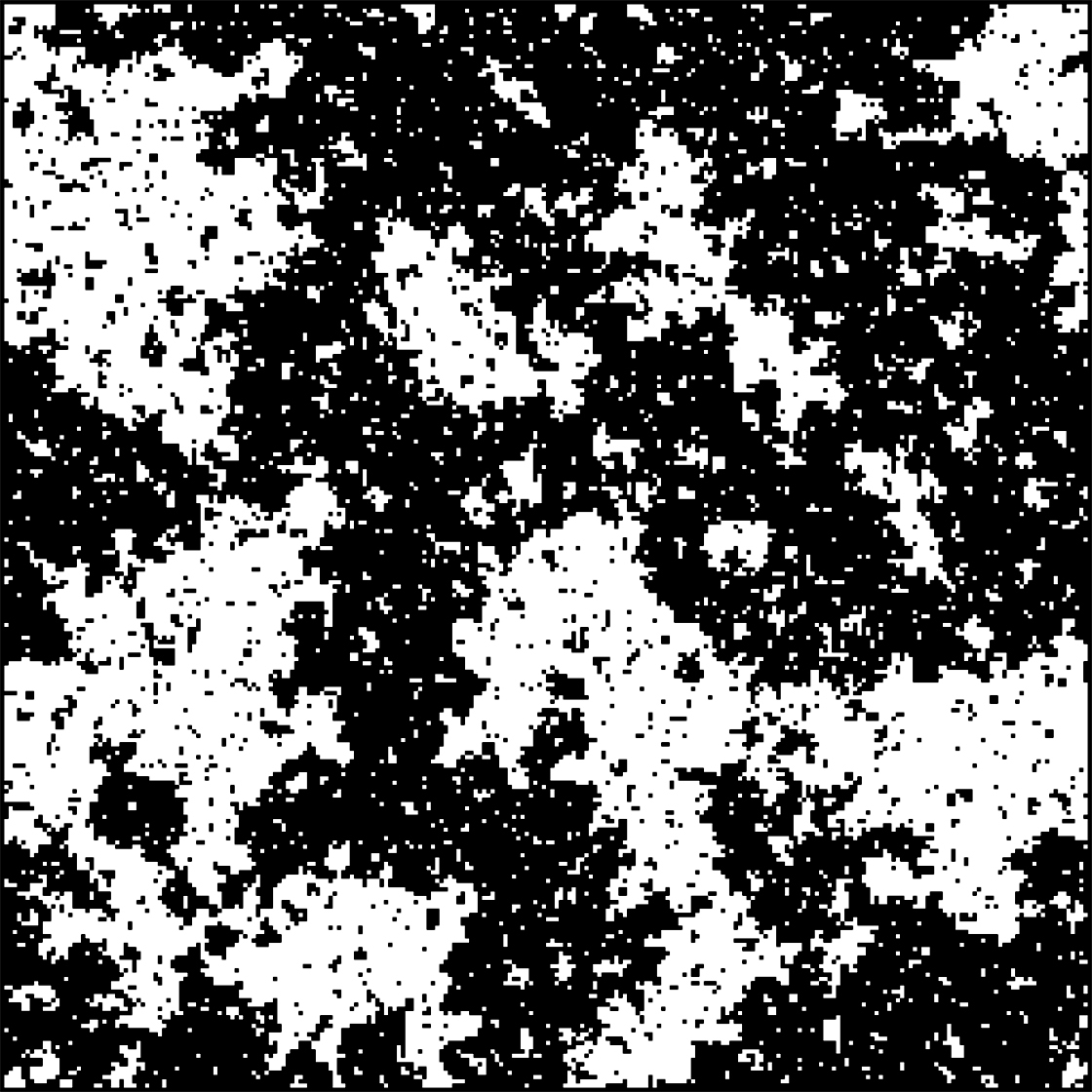 At the critical temperature, islands of all sizes coexist, from dots to continents. Here, one arrow can flip another, distant arrow, despite their not being neighbors—an indication that the system’s macroscopic properties have detached from its microscopic details. This detachment is the magic of universality. All systems with the same number of dimensions and the same symmetries go through identical phase transitions, regardless of whether their microscopic parts are iron atoms, water molecules or little arrows.
