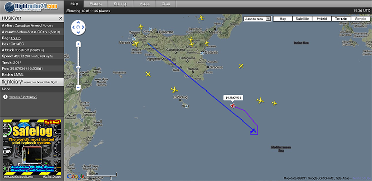 In contrast to the 1990–1991 Gulf War, seemingly a spectacle that the public assimilated passively, the 2011 Libyan war offered a massive dataset for the public to actively sift through on the Internet. As a result, it gave us arguably the first cloud-enabled war. NATO spokesman Mike Bracken described a NATO “fusion centre” that data-mined Twitter feeds and open source databases on the Internet to glean potential targets, battlefield conditions, and other tactical information: “ ‘Snippets of information’ ... could then be tested, corroborated or not, by NATO’s own sources, including imagery and eavesdropping from Nimrod spy planes.”1 At the same time, in an interview with the Dutch public broadcaster NOS, the hacker Dirk de Jager also called on listeners to participate in mining these data. Begin with data collection, he said, then sort and analyze the input, and finally the “data puzzle pieces” would fall into place. One might listen, as Huub did, to live air traffic control streams from Malta via liveatc.net and attempt to identify a mysterious plane communicating with the controller—possibly a getaway plane for Gadhafi’s relatives—and correlate that with another stream from Twitter, or to geotag the data’s location in what is known as KML format (see image below). And when the conflict started, the Malta feed even let users anticipate drone strikes by listening for the code “MQ-1,” the designation for Predator drones.