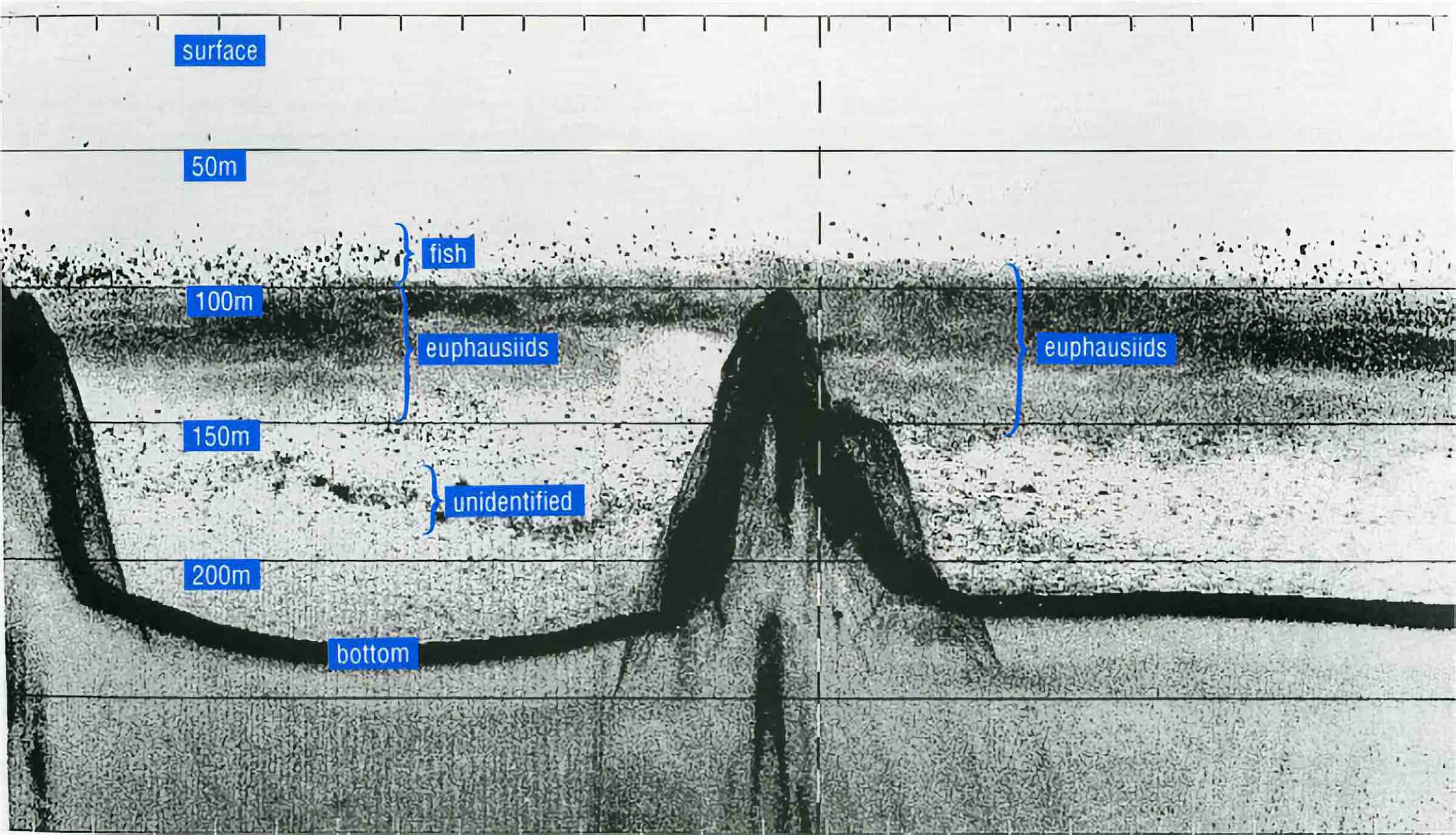 But there was a problem. The seabed kept moving, reading as shallower at night and deeper during the day. In time, the scientists discovered that they were looking at a “false bottom” composed of colossal, tightly-packed schools of shrimp, squid, and siphonophores.