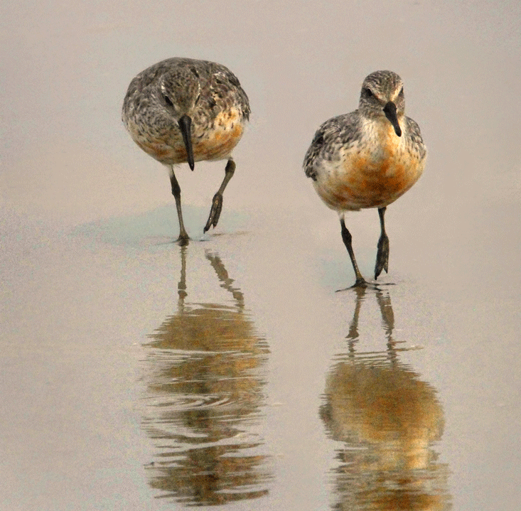 Other shorebirds favor different foods and therefore exhibit somewhat different behaviors in relation to the water. Where the knot stays at the edge, the dunlin is happy to wade into the water after its prey. Avocets use their upturned bills to skim very shallow water for rag worms and shrimp. The oystercatcher can break into the harder shells of limpets using its jackhammer of a bill. In the Bay of Fundy, up to 2 million semipalmated sandpipers stop off on their migration to feast on mud shrimp, the location favored because the invertebrates develop earlier there owing to the exceptional tidal range, which in turn guarantees a more reliable food supply.