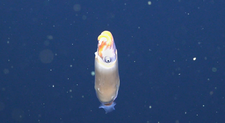 This ram’s horn squid was captured on video for the first time ever in October of 2020 by researchers aboard Schmidt Ocean Institute’s vessel Falkor. Despite the name, this animal isn’t technically a squid, but rather a cephalopod. The “ram’s horn” refers to a spiraled internal shell that serves as its skeleton. They average around 1 to 3 inches in length and have a light-producing organ atop their mantle that allows them to send visual signals in the darkness of the deep.