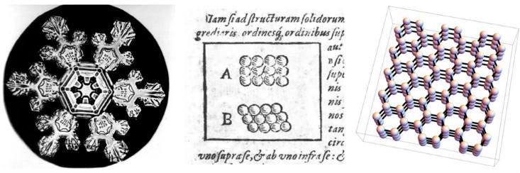 We now know that Kepler’s conjecture about the specific arrangement of atoms was slightly wrong—the arrangement he drew doesn’t correctly account for the 3D shape and complex interactions of water molecules. (In fairness to Kepler, chemistry hadn’t been invented yet, and the existence of atoms wouldn’t be proven conclusively until almost 300 years later.) Nevertheless, he was on the right track. The six-fold symmetry of snowflakes does come from the fact that the water molecules are arranged in a 3D structure with hexagonal symmetry.3