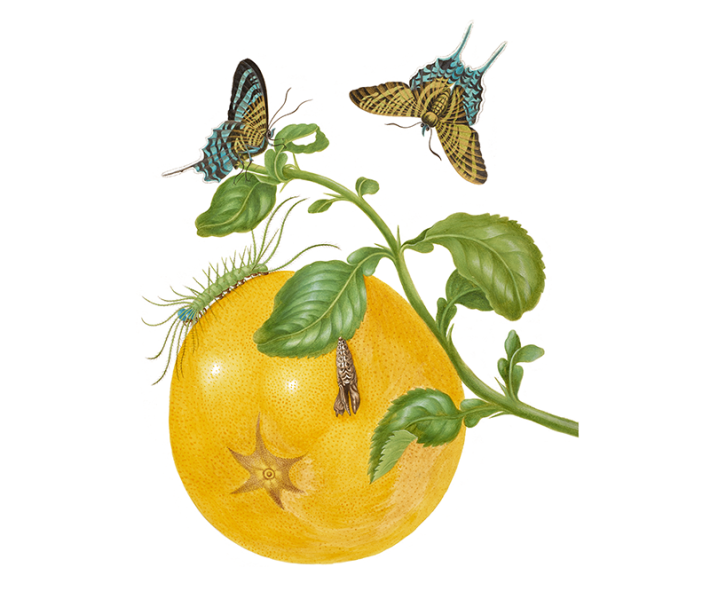 But Merian also benefitted from enslaved labor: When embarking on an expedition into the rainforest, she sent her “slaves ahead with axe in hand,” she wrote, to hack a path through the dense undergrowth. After contracting a weakening illness—possibly malaria—Merian returned to Holland in 1701, laden with specimens, field notes and sketches. She worked her research into her book Metamorphosis, which was published in 1705 in Amsterdam. Merian’s hand-colored illustrations showed insects interacting with the plants that sustained them—an innovative approach as flora and fauna were typically illustrated separately.
