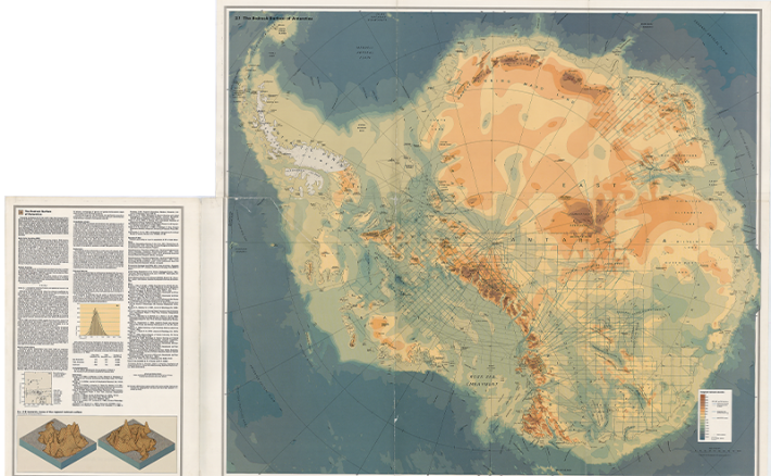 Glaciologists badly needed compiled maps to understand the evolving ice sheet. The first hand-drawn, continent-wide bedrock maps, Glaciological and Geophysical Folio, released in 1983, were “lovely, aesthetic” maps, says Siegert—ones that might today look handsome framed on a study’s wall but couldn’t be directly fed into computer models. That changed when an international effort led by the British Antarctic Survey released Bedmap in 2001, a continental-scale gridded product. But in terms of data quality, Siegert explains, the map wasn’t much of an improvement on the hand-drawn 1983 effort. Bedmap2, released in 2013, benefited from a much larger trove of data, offering a far sharper picture of what lay below. But huge swaths of Antarctica were, and still are, unexplored by radar flights.