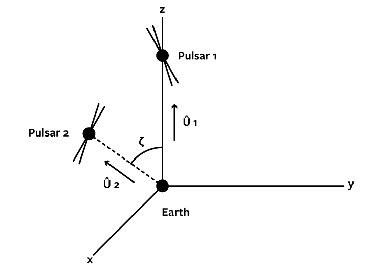 But the bobbing from Earth, while it’s noisy, has some structure. That structure is what Hellings and Downs mapped out. When gravitational waves make the Earth bob, they change the arrivals of flashes from all pulsars at the same time. Gravitational waves squeeze in one direction, compressing spacetime, while stretching in the other, expanding it. Imagine that along a north-south line, space condenses. At the same time, east-west expands. Two pulsars in the northern direction of our sky would show similar speedups in the timing of their blips, and two pulsars in an eastern direction would have similar slowdowns.