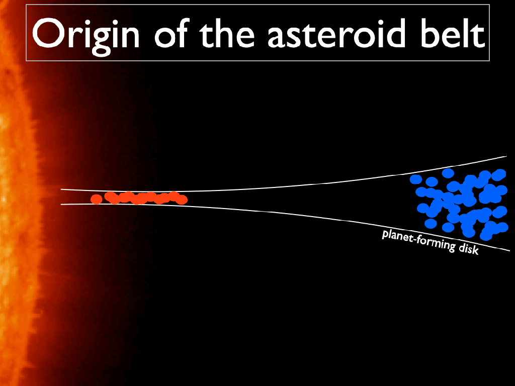 Planetary scientists think that some—and maybe all—asteroids are immigrants. They were likely born in a different part of the solar system, and later implanted into the belt. We think this happened in two phases. First, when the gas giant planets Jupiter and Saturn formed, their gravitational forces scattered objects in all directions. A lot of those objects were lost from the solar system entirely; many others probably collided with the growing rocky planets (delivering water). But some were trapped in the asteroid belt, preferentially in the outer parts. Those were the carbonaceous asteroids. Later, when the rocky planets were in the last phases of their growth, they scattered some objects outward, and some were trapped in the asteroid belt, preferentially in the inner parts. Those were the “ordinary” asteroids.