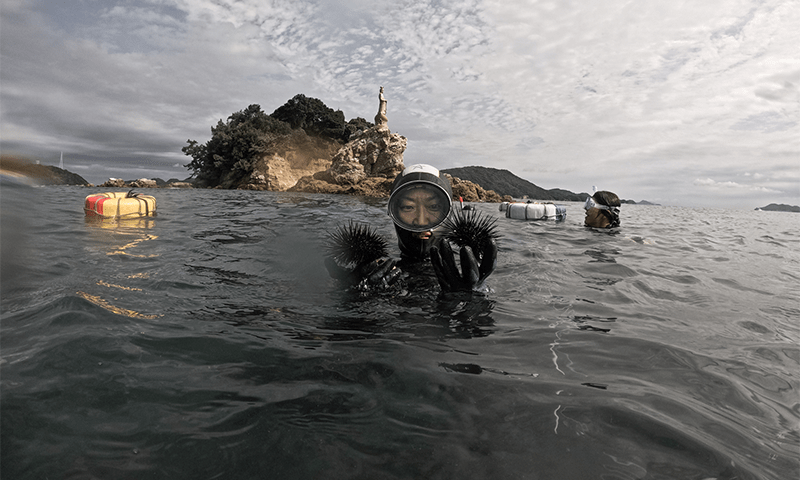 Lead image: Aiko Ohno displays the sea urchins she gathered in a plunge. She is one of two apprentices hired by the local government to learn ama diving techniques, and moved from bustling Tokyo to tranquil Toba to continue the craft. Credit: Edges of Earth / Adam Moore.