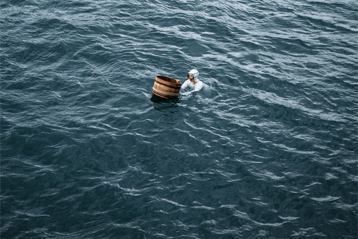 While ama rules have been updated to accommodate the use of thin rubber wetsuits and fins—making the job slightly more comfortable, as well as less daunting to newcomers—these changes are relatively recent. Ancient woodblock prints portray early ama diving with open eyes, naked breasts, and flowing skirts; following World War II, the ama started sporting a circular facemask and exchanged skirts for sheer white bodysuits and bandanas. This now-iconic white outfit was thought to represent the Shinto sun goddess and help keep sharks away. Because these white overalls don’t absorb as much heat as a black outfit would, they are also thought to prevent fisherwomen from spending too long underwater and overharvesting the seabeds on which they depend.