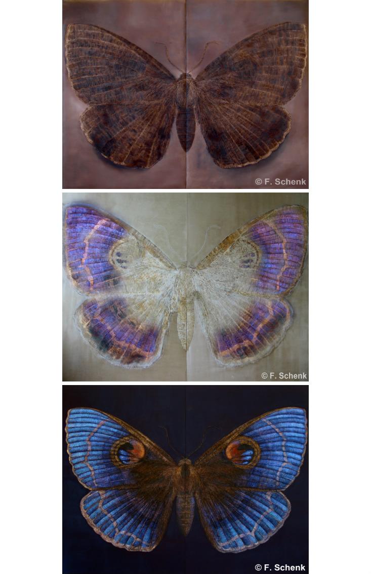 Meanwhile Schenk endeavored to create iridescent paints that could be applied to canvas. Commercially available paints billed as iridescent showed only pale, faintly metallic colors, not nature’s vividly shimmering hues. Then she obtained top-of-the line iridescent materials that were supposed to display shimmering purple, gold, and red. Drab grey powders, they were unlike any pigment she had seen before. They consisted of minuscule flakes made of silica coated with several metal-oxide layers. It took a year of experimentation to understand how to turn the powder into a spreadable paint and mix it without destroying its optical qualities.