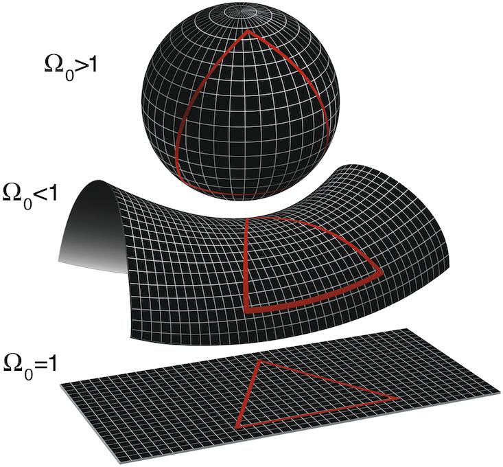 This was too conservative of Einstein, Friedmann thought. He instead viewed Einstein’s model as just one example of many possible universes. So, in 1922, publishing in the leading European science journal Zeitschrift für Physik, Friedmann derived three kinds of cosmological models that were much more dynamic than Einstein’s: One was a finite universe of positive curvature—like a sphere—that expanded from a singularity and then eventually stopped expanding and collapsed back to a point; the second: an open infinite universe of negative curvature, which could be pictured like a saddle of infinite size; and finally: a universe of zero curvature—a flat plane—that expanded at an ever slower and slower rate, coasting into infinity.