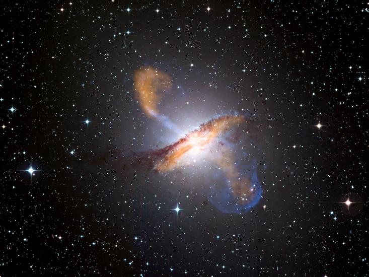 Despite having this standard model of an AGN—a supermassive black hole surrounded by an accretion disk with jets streaming out in opposite directions, all encompassed by a dusty torus—making sense of our observations is still a challenge: The light we see doesn’t always paint the same picture. Sometimes we see jets, sometimes we don’t. Sometimes we see the torus, sometimes we don’t. Sometimes we see light so concentrated and bright that we can’t even tell if there’s a galaxy there at all. We label these sightings accordingly: AGN at great distances with cores so bright, they outshine all their stars in optical light, are called quasars (for “quasi-stellar”), like the one pictured above; AGN that glow strongly in the infrared are called Seyferts, after the astronomer Carl Seyfert, who first identified them in 1943; And AGN, with cores and jets whose emitted light dominates in the radio spectrum, are called radio galaxies.