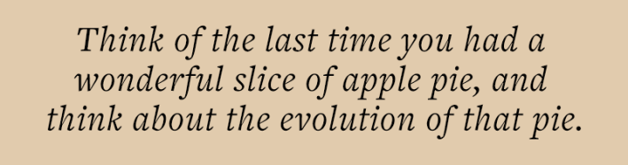 Think of the last time you had a wonderful slice of apple pie and think about the evolution of that pie. There are all sorts of ingredients—flour, sugar, cinnamon, apples—that you can put together; and you can imagine those ingredients taking on any number of configurations, most of which would be absolutely horrendous, and not taste very good at all. But, through refining the recipes for apple pies, we’ve landed on relatively few configurations that work, that are delicious, that get selected and passed on and recorded in cookbooks, over generations. And so those apple pies that are selected for are the ones that we get to enjoy in bakeries, or that we make at home.