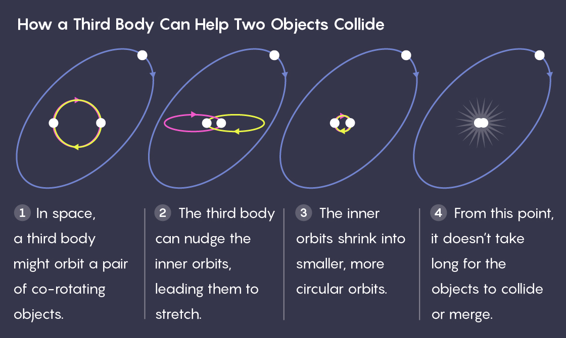 In the past few years, another idea has appeared. Under the right conditions, a third object can trigger a process that brings a pair of objects closer together. This three-body effect provides a way for far-apart massive stars to first collapse into black holes, and then draw close enough to collide. And because massive stars are often in triple systems, researchers say it’s important to take this three-body effect into account.