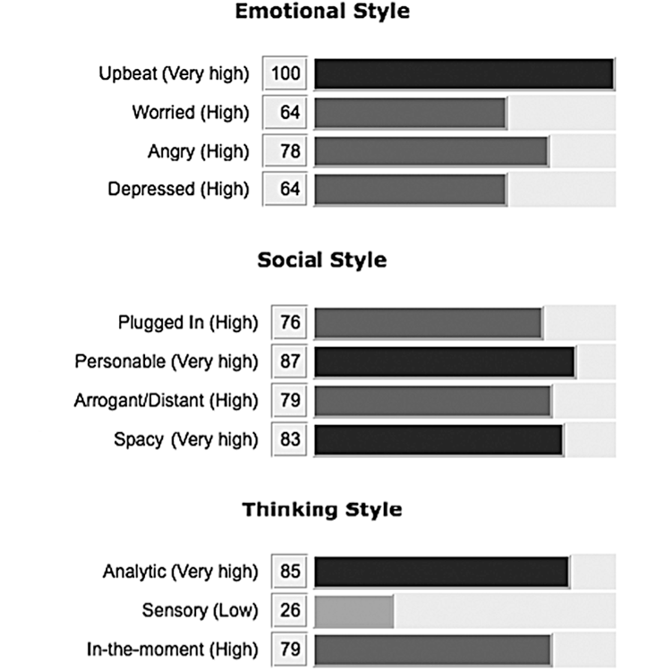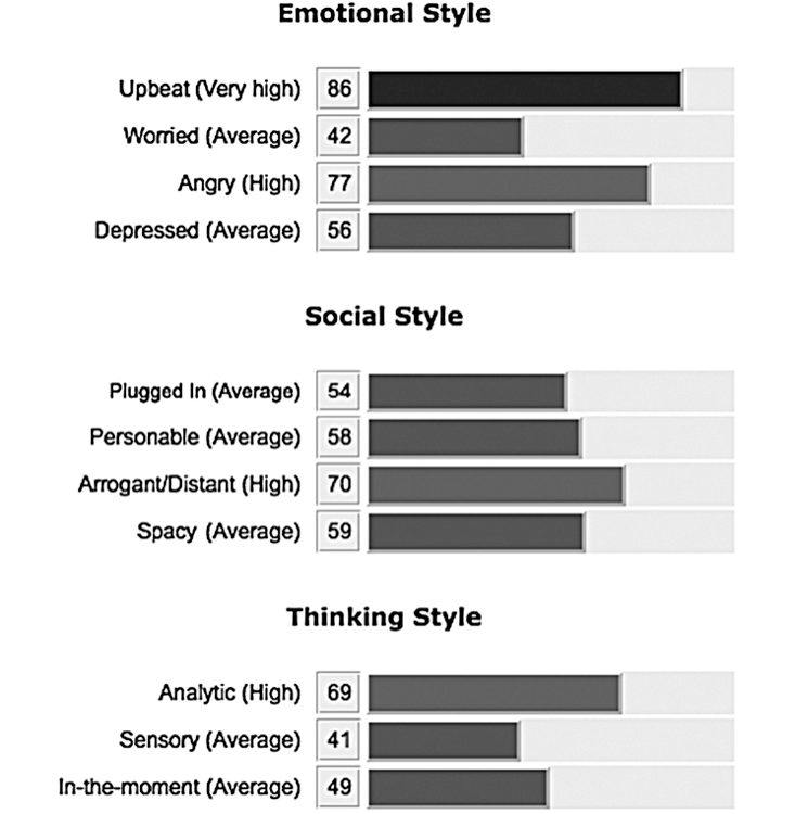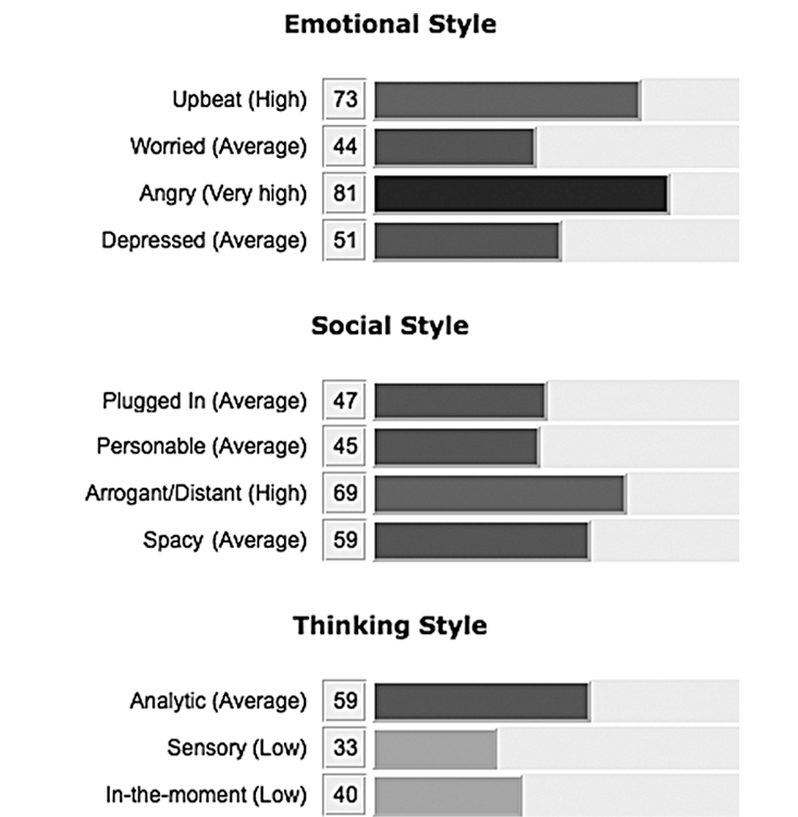 Analytic: 4, Angry: 15, Arrogant: 21, Depressed: 5, In-the-moment: −3, Personable: 1, Plugged In: −3, Sensory: −3, Spacy: 0, Upbeat: 5, Worried: 17>