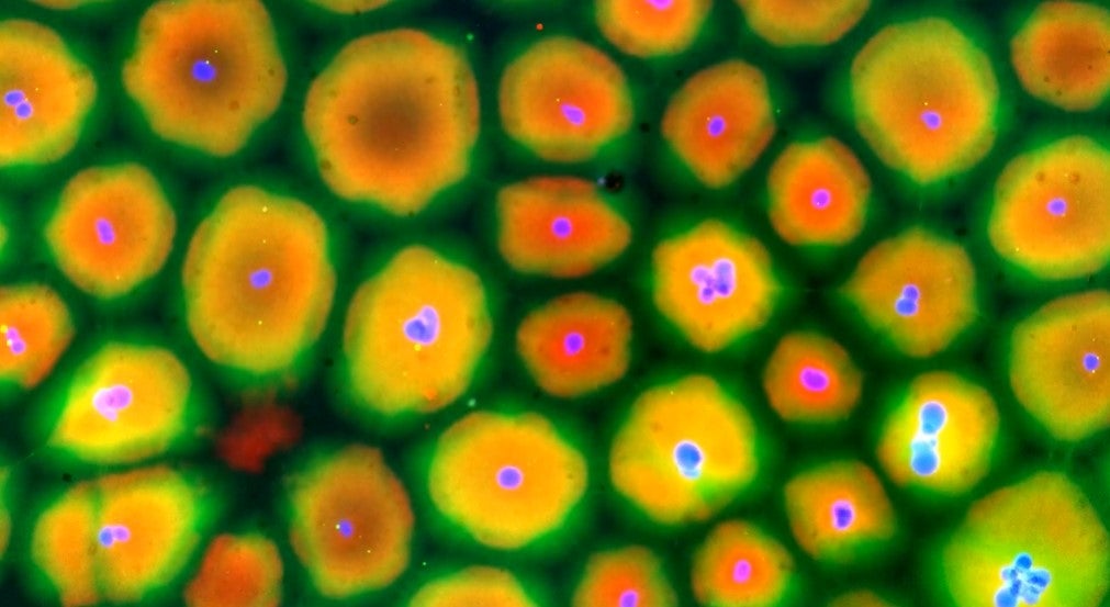 Lead Image: This blended, homogeneous mass of cytoplasm spontaneously organizes itself into many small compartments centered on a nucleus (blue) and separated by voids. Organelles in the cytoplasm, such as microtubules (green) and endoplasmic reticulum (red) also position themselves around the nuclei. Credit: Xianrui Cheng