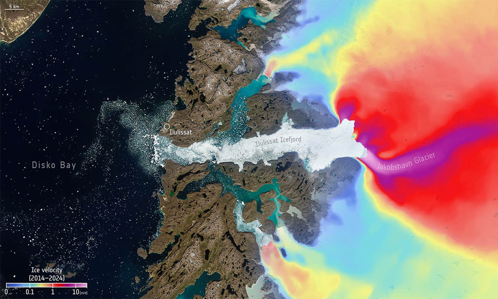You’re looking at one of the quickest moving glaciers in the world—the bright hues added to this satellite image of Jakobshavn Glacier in Greenland represent the average speed of ice movement between 2014 and 2024. Ice was observed to travel up to about 160 feet per day, or around the width of a football field, according to the European Space Agency (ESA), whose Copernicus Sentinel-1 satellites recorded these trends. There could be a few reasons why: For one, the floating edge that once met the seafloor may have melted enough to no longer serve as a “doorstop” to slow down the glacier’s movement.