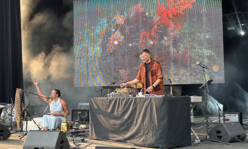 Lead art: Singer Whaia and sound artist Brian d’Souza on stage at the “Nautilus Village” during the United Nations Ocean Conference in Nice, France. Photo by Kevin Berger.