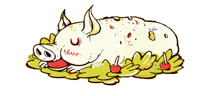 Whole pig broiled over an open fire, served with inamona relish made with mashed roasted kukui nuts