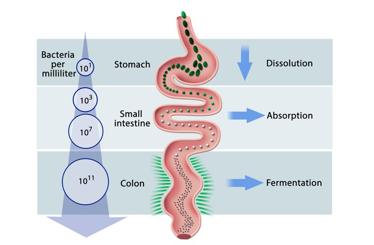 They drop, undigested, into the slough-like environment of the colon. With a neutral pH of about 7, the colon is a paradise for bacteria compared to the acid vat of the stomach or the churning rapids of the small intestine, where the pH is slightly lower.