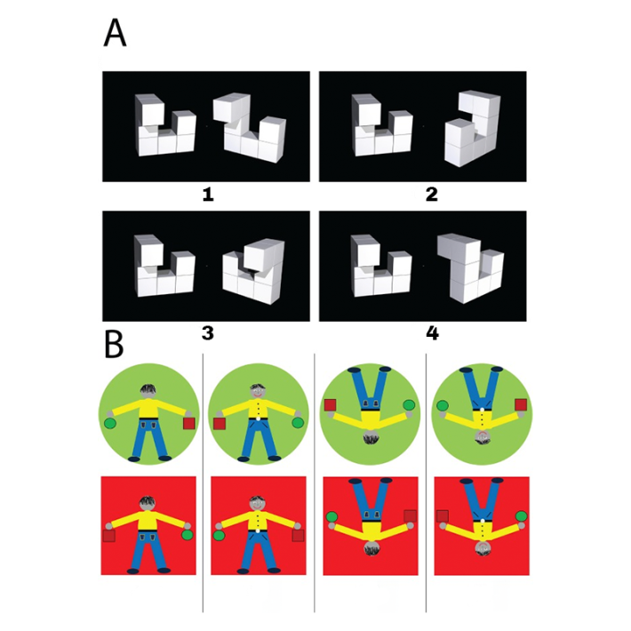 This is the question that Kay and colleagues set out to answer in their latest study, published earlier this year in the peer-reviewed journal Consciousness and Cognition. They recruited people with aphantasia and people with normal visualization abilities and had them perform a series of tasks involving mental rotation. The participants had to compare two images and guess, as quickly as possible, if the images were showing the same object from different angles or not. In one set of tests, the objects to be compared were three-dimensional assemblies of cubes, while in another one they were stick figures with geometrical shapes in their hands.