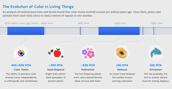 To his surprise, the emergence of these color-coded signals didn’t even come close to the earliest appearance of color vision. Color vision likely evolved twice independently, he found, and around the same time: between 400 million and 500 million years ago in arthropods, such as insects, and in backboned animals, such as fish. That places the evolution of color vision 100 million or 200 million years before any color signals.
